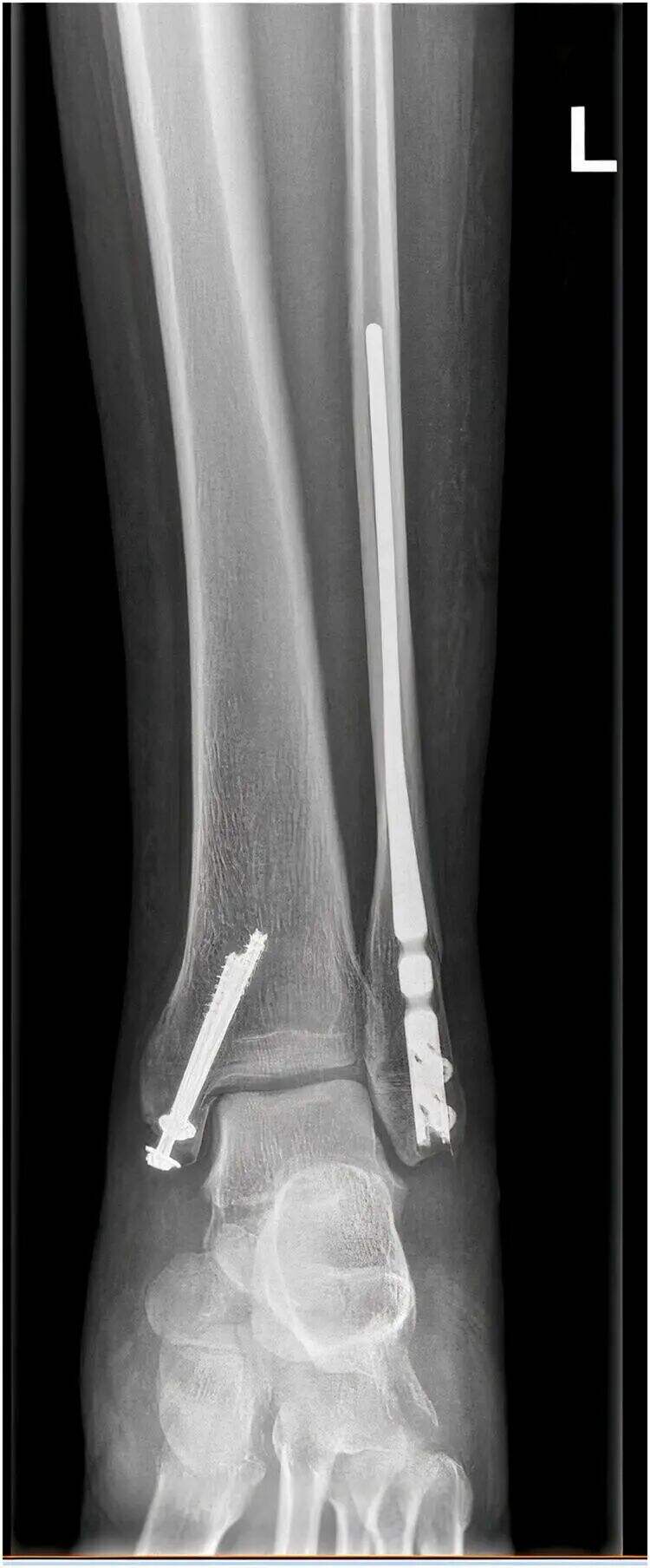 4. A szindestmótikus csavar vonatkozásában: Amennyiben az intramedullaris tű elegendően hosszú, és jól illeszkedik a csontvelőcsatornához, az intraoperatív vizsgálat során előfordulhat, hogy a tű maga biztosítja a szindestmótis elegendő stabilitását. Ha a tű beültetése után a horogteszt vagy az externális rotációs terheléses teszt stabil szindestmótist mutat, a szindestmótikus csavar beültetése elmaradhat.