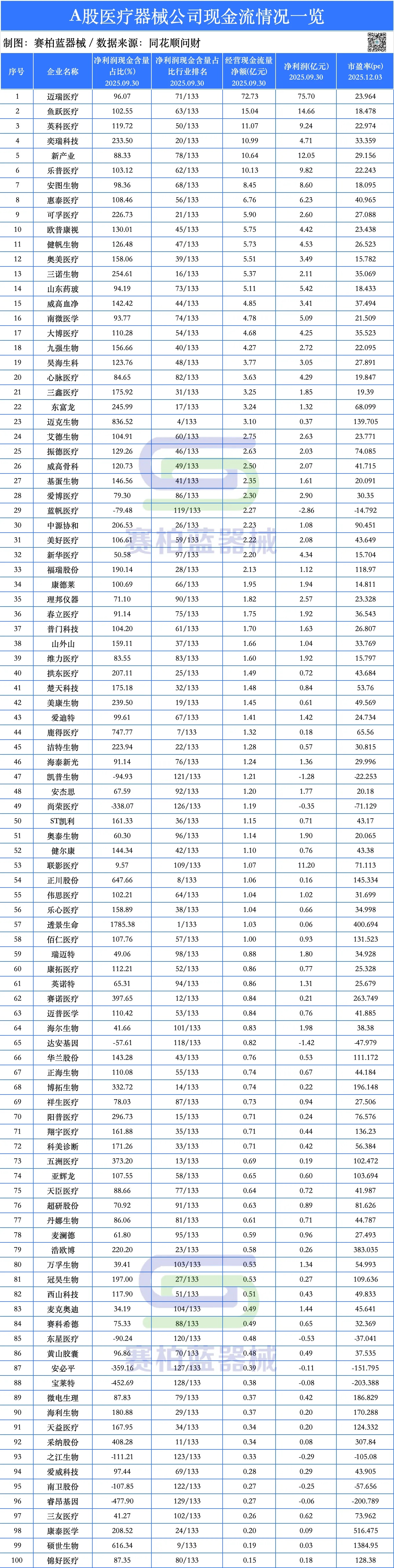 De acordo com dados da Tonghuashun Wencai, até 30 de setembro de 2025, as 10 principais empresas de dispositivos médicos listadas em ações A por fluxo de caixa operacional líquido são Mindray, Yuyue Medical, Intco Medical, iRay, Snibe, Lepu Medical, Autobio, Huirui Medical (HTWM), Co-foe Medical e Opcom. Dentre as 10 primeiras, exceto Mindray, Snibe e Autobio, o fluxo de caixa operacional das demais empresas supera seu lucro líquido. A iRay apresenta a maior proporção de caixa sobre lucro líquido, de 233,5%.