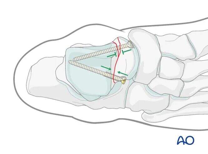 Ti vijaki ne morajo biti postavljeni vzporedno, saj se njihovi mehanizmi razlikujejo: lateralni vijak zagotavlja kompresijo, medtem ko medialni vijak služi le za pozicijsko fiksacijo.