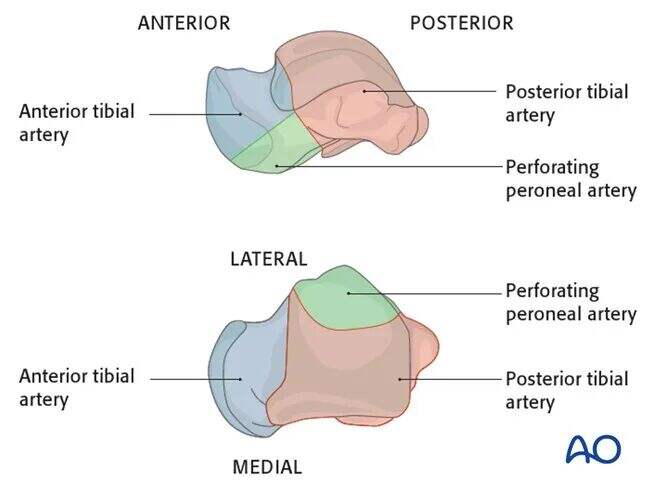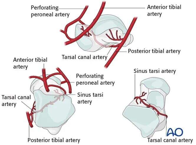 Dovajanje krvi do talusa je močno okrnjeno pri zlomih s dislokacijo. Zadnja tibialna arterija oddaja veje medialno, dorsalis pedis arterija anteriorno in peronealna arterija lateralno. Te posode anastomozirajo prek vaskularne mreže znotraj tarzalnega kanala.