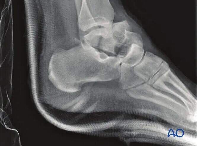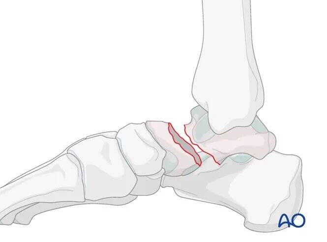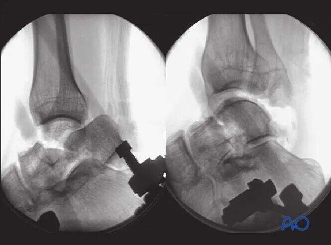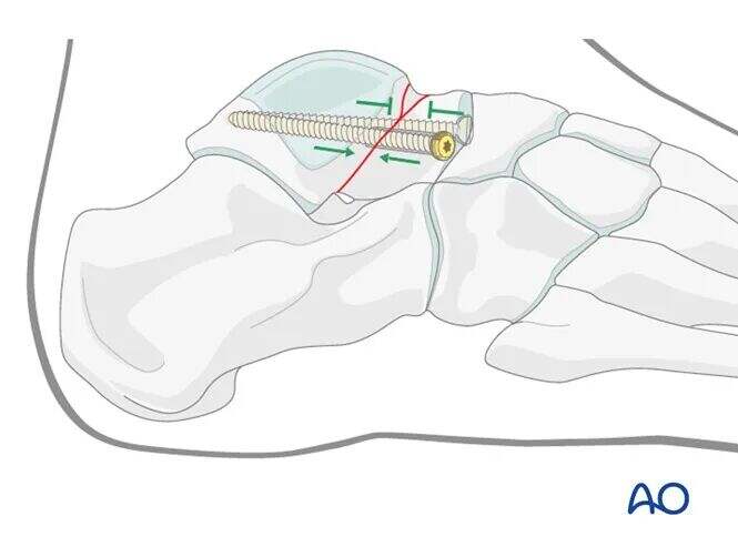 Zaradi pogoste drobljenja medialno je treba izogniti zamuju. Vijaki tukaj zahtevajo fiksacijo brez kompresije (pozicijski vijaki). Glava vijaka je običajno upognjena na medialnem robu talonavikularne sklepnice.