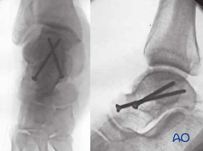 Intraoperativni pregledi s C-armom zagotavljajo natančno redukcijo vseh sklepnih površin talusa. Canalejevi posnetki gležnja in stopala potrjujejo zadovoljivo redukcijo in fiksacijo fraktur vratu talusa.