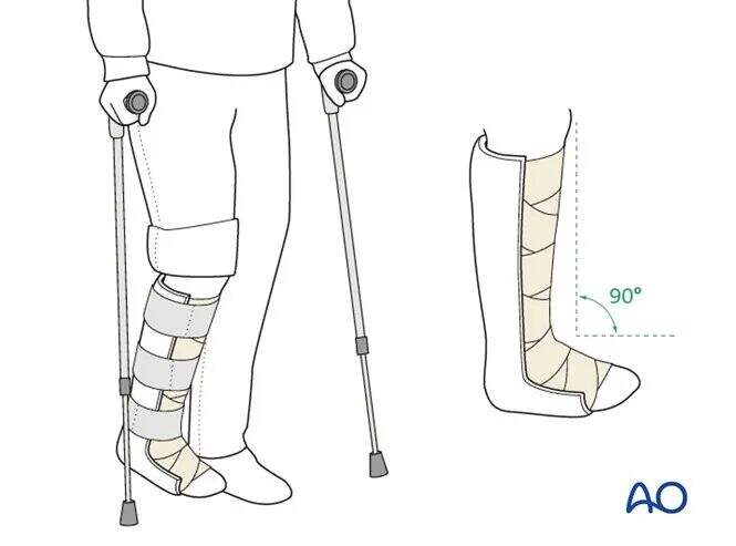 ● Po operaciji naj bo noga imobilizirana v zadnjem ščitniku v nevtralnem položaju. Priporočajo se zgodnje mobilizacijske vaje za sklepe gležnja in podgolenca.