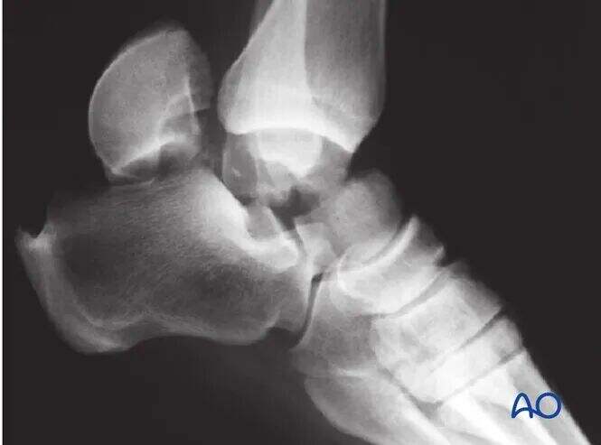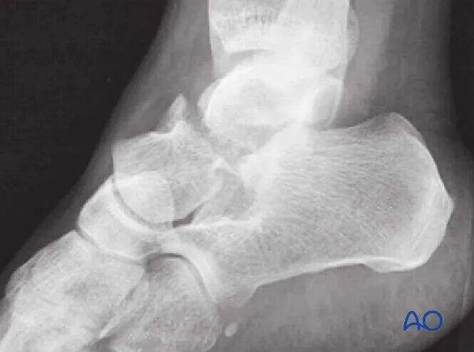 Lateralno ni izgube kosti in je fraktura stabilna zaradi medsebojnega vpenjanja, kar ji omogoča, da prenese tlačna napetost. Optimalna metoda fiksacije je kanalizirani zatezni vijak. Vijak mora potekati skozi kost lateralnega vratu talusa, ne skozi sklepni hrustanec.