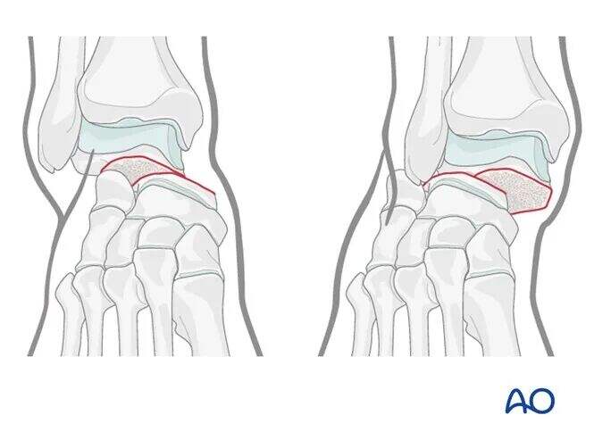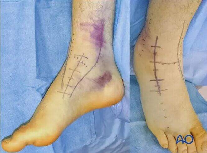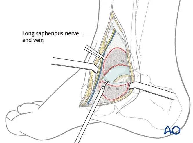 Med postopkom je treba ohraniti vse mehko tkivne pripone na talarnem telesu (viri oskrbe s krvjo). Običajno je potreben dvojni pristop z rezom.