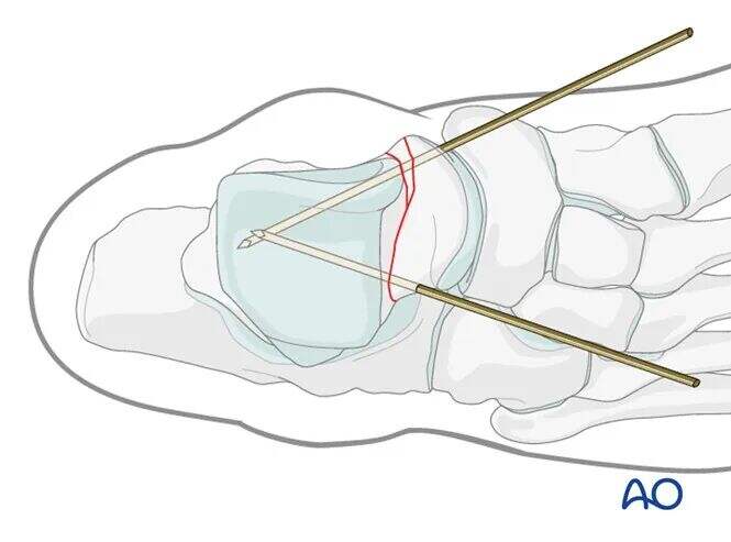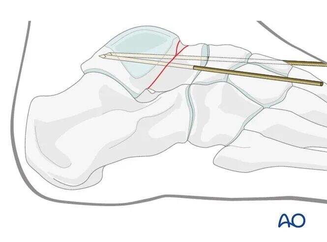 Medialne K-žice so običajno najbolje postavljene skozi medialni del artikularnega hrustanca glave talusa, da omogočijo naknadno upogibanje glave vijaka.