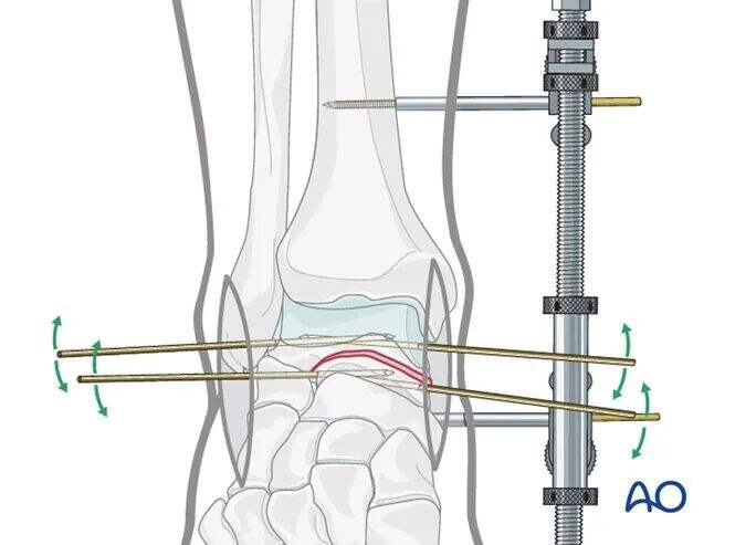 Če kombinirani pristop še vedno ne omogoči redukcije, nadaljujte na naslednji način: najprej uporabite periostalne dvigala in vodilne žice, nato namestite eksterni fiksator in distraktor ter končno izvedite osteotomijo medialnega maleolusa (najinvazivnejša, a najbolj definitivna metoda). Vsak korak izvajajte pod fluoroskopskim vodenjem s C-lokom.