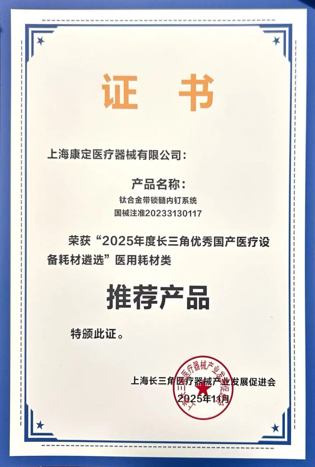 Šanghajsko podjetje za medicinske pripomočke Kangding Medical Device Co., Ltd. prejelo dve pomembni priznanji zaradi izjemne sposobnosti inovacij izdelkov in vpliva v panogi – njegov Sistem titanovega zlitine zaklenjenega intramedularnega nožiča je bil uvrščen med priporočene izdelke v kategoriji medicinskih potrošnih materialov na izboru »2025 Yangtze River Delta odlične domače medicinske opreme in potrošnih materialov«, podjetje pa je bilo tudi izvoljeno za Člansko enoto strokovnega odbora za mednarodno sodelovanje pod Shanghajskim združenjem za spodbujanje razvoja medicinske opreme industrije reke Jangca, kar ga uvršča med poudarke sejma.