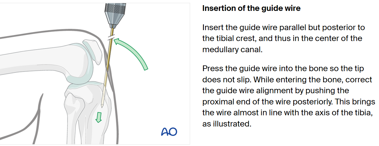* Položaj vodilne žice: Distalni konec vodilne žice naj bo sredinsko postavljen v sklepu gležnja, približno 1 cm proksimalno od tibialne ploščice. Potrdite položaj z AP in lateralno fluoroskopijo.