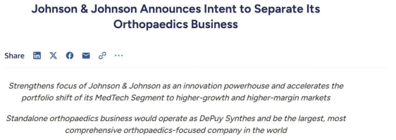 Johnson & Johnson tha se qëllimi kryesor i ndarjes së biznesit të ortopedisë DePuy Synthes është forcimi i fokusit strategjik dhe operativ të secilës kompani, duke e drejtuar në këtë mënyrë vlerën për palët e interesuara. Kjo lëvizje nuk është një ngjarje e izoluar, por zhvillimi më i ri në valën e fundit të ndarjeve të bizneseve midis kompanive të mëdha të teknologjisë mjekësore. Para kësaj, Zimmer Biomet ka shitur bizneset e tij të kolonës kurrizore dhe stomatologjisë, Baxter ka shkeputur biznesin e tij renal, dhe Medtronic dhe BD kanë shitur përkatësisht bizneset e tyre të diabetit. Veprimi aktual i Johnson & Johnson përputhet me tendencën industriale të konsolidimit dhe fokusimit.